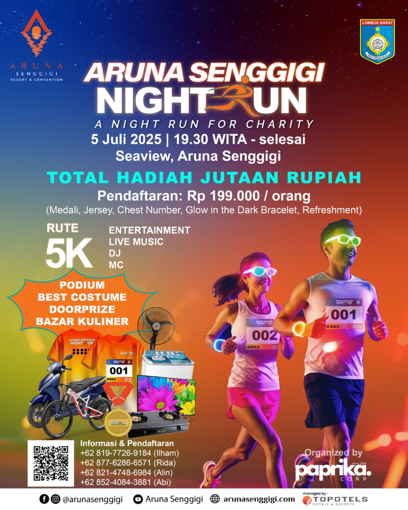 FIRSTCHOICE.ID – Aruna Senggigi Resort & Convention dengan bangga mengumumkan penyelenggaraan Aruna Senggigi Night Run 2025, sebuah ajang lari malam yang penuh semangat dan makna, yang akan diselenggarakan pada Sabtu, 5 Juli 2025 mulai pukul 19.00 WITA di kawasan wisata Senggigi, Lombok.